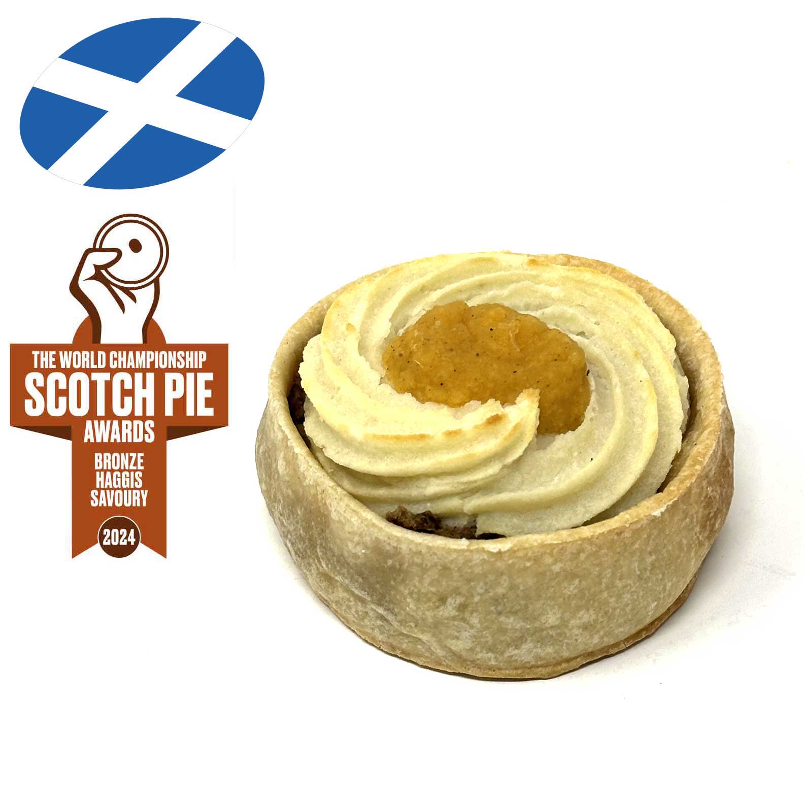 Support our home team with our award-winning Haggis Pie! Our handmade scotch pie shells filled with spicy Macsween haggis then topped with a piping of mashed tattie and a dollop of colourful neeps have been called 'The Chieftain o' the Pies'.